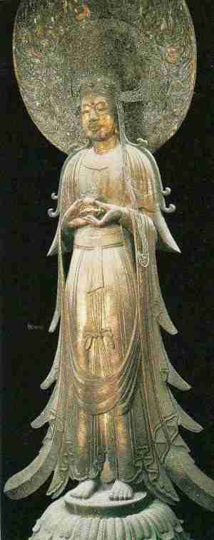 救世観音像。実物はもっと金銅色に輝いています。仏像というより聖徳太子その人を見るようです。