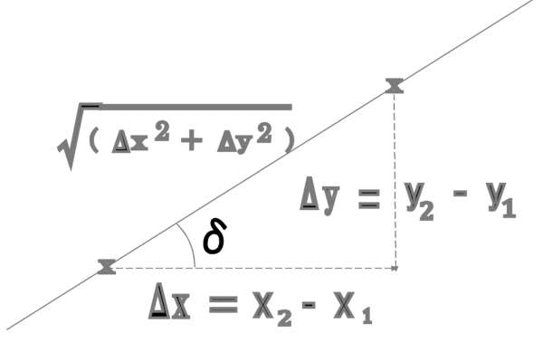 これを成分表示で表すと、 ![]() これが、2点 (x1,y1), ( x2 ,y2 ) を通る直線の式である。これを別の形に変形するとより分かり易いかも知れない。 ![]() つまり、線分 AP と線分 AB の傾きが等しいことを表している。 あるいは、直線の傾きの角度を δと置くと、 ![]() だから、
