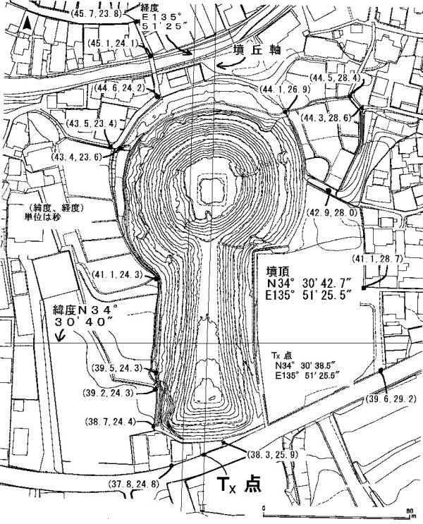 1.計測方法と計測データ(1)GPSと測定法 GPSは米国GARMIN社製のeTrexHを用いました。(図2)周囲に障害物が無く上方が開けていれば、GPS衛星を多数捉えることが出来るので、最良の場合、精度約1/10秒で測定できます。方法は測量図上で目印となる地点を選び、 GPSのマーク(記録)機能でポイントに名前を付けて記憶し、後で呼び出して図上のポイントに緯度経度を記入し分析を行いました。 (2)調査古墳 調べた古墳は、箸墓古墳、行燈山古墳、桜井茶臼山古墳、渋谷向山古墳、および奈良市の宝来山古墳(伝・垂仁天皇陵)の5ケ所です。またこれらの古墳実測図として、 大和前方後円墳集成(県立橿原考古学研究所編)記載の図を利用しました。ただし、茶臼山古墳だけは掲載の図が古く測量精度も悪いため、 代わりに橿原考古学研究所の茶臼山古墳の調査報告書の図を利用させていただきました。 (3)実測データ 以上5つの古墳の周辺ポイントの緯度経度の実測結果を以下に示します。(図3〜図7)ただし図中の(、)内の数値は(緯度、経度)の秒単位の部分です。 これらに基づいて図中には推定緯度線および経度線も記入しました。 ![]() ![]() ![]() 2.データの解析の方法(1)緯度補正地球は球体(回転楕円体)であるため、緯度によって、緯度や経度の1°の長さが異なる。我々の分析では実際それぞれの1"(1秒)の長さが問題となります。 理化年表によれば、経度1"の長さlx (m)は ![]() この値は該当の古墳緯度では表1のように計算される。